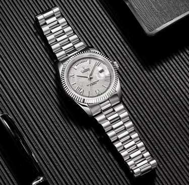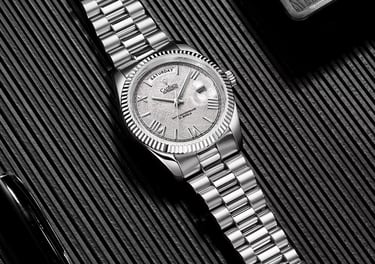Crafted in stainless steel with a bold fluted bezel, this automatic timepiece delivers timeless elegance for everyday wear.